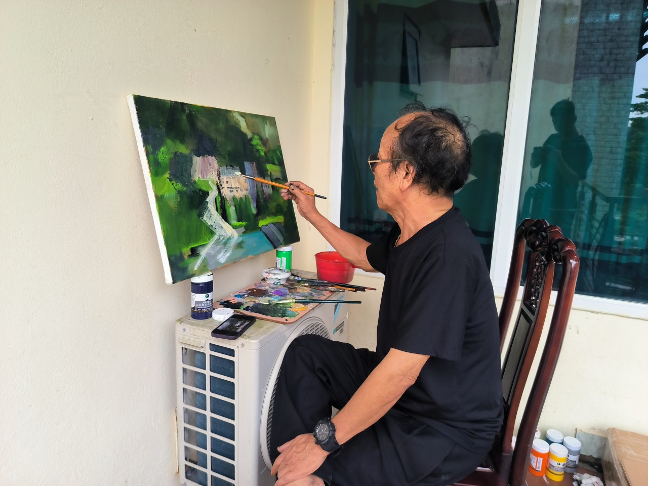 Họa sĩ Nguyễn Hoàn Thiện (Hội Văn học - Nghệ thuật Lào Cai) sáng tác tại Trại.